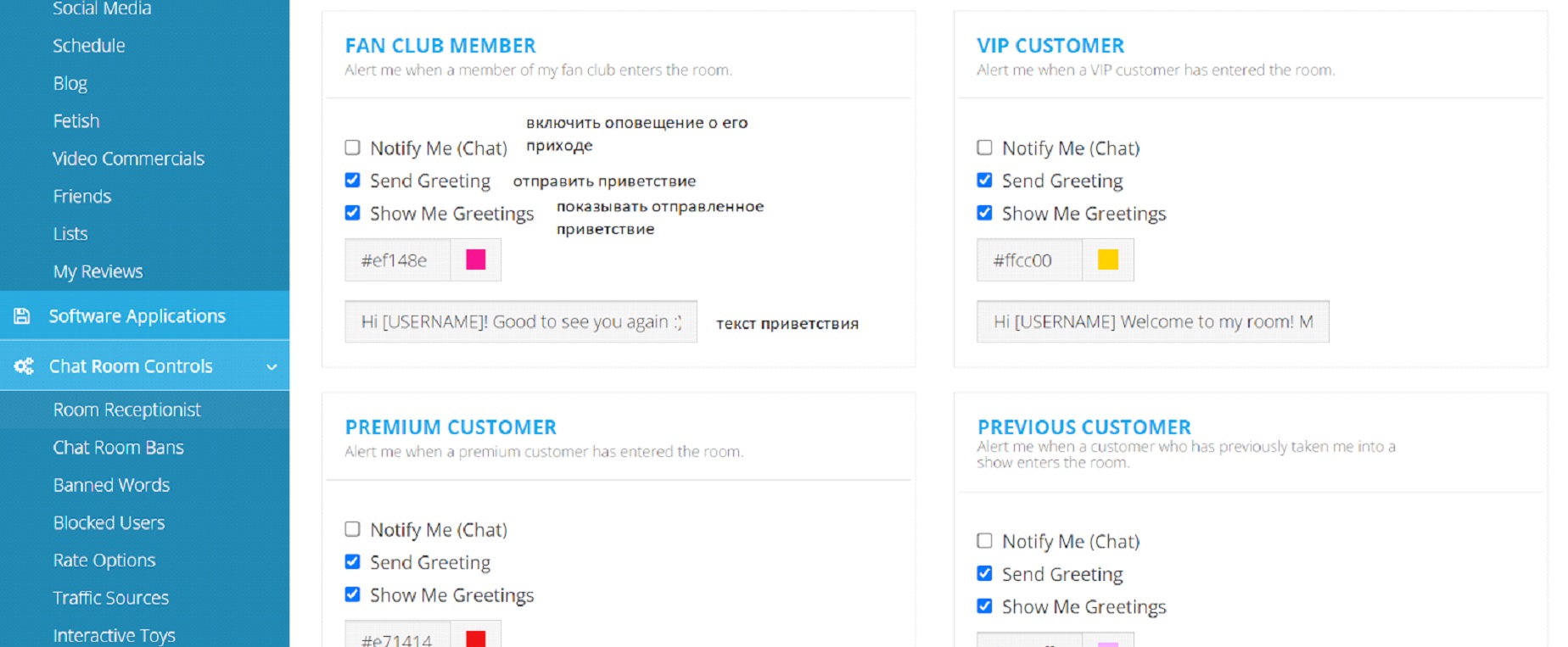 Система от имени модели сама отправляет приветствия пользователям, гостям, подписчикам и всем-всем по вашему желанию.